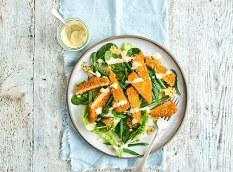 To serve, divide the lettuce and spinach onto 10 bowls, add the breaded fillet strips, French beans, crumble over the parmesan crisps and drizzle each bowl with the dressing. Season with freshly ground cracked black pepper.